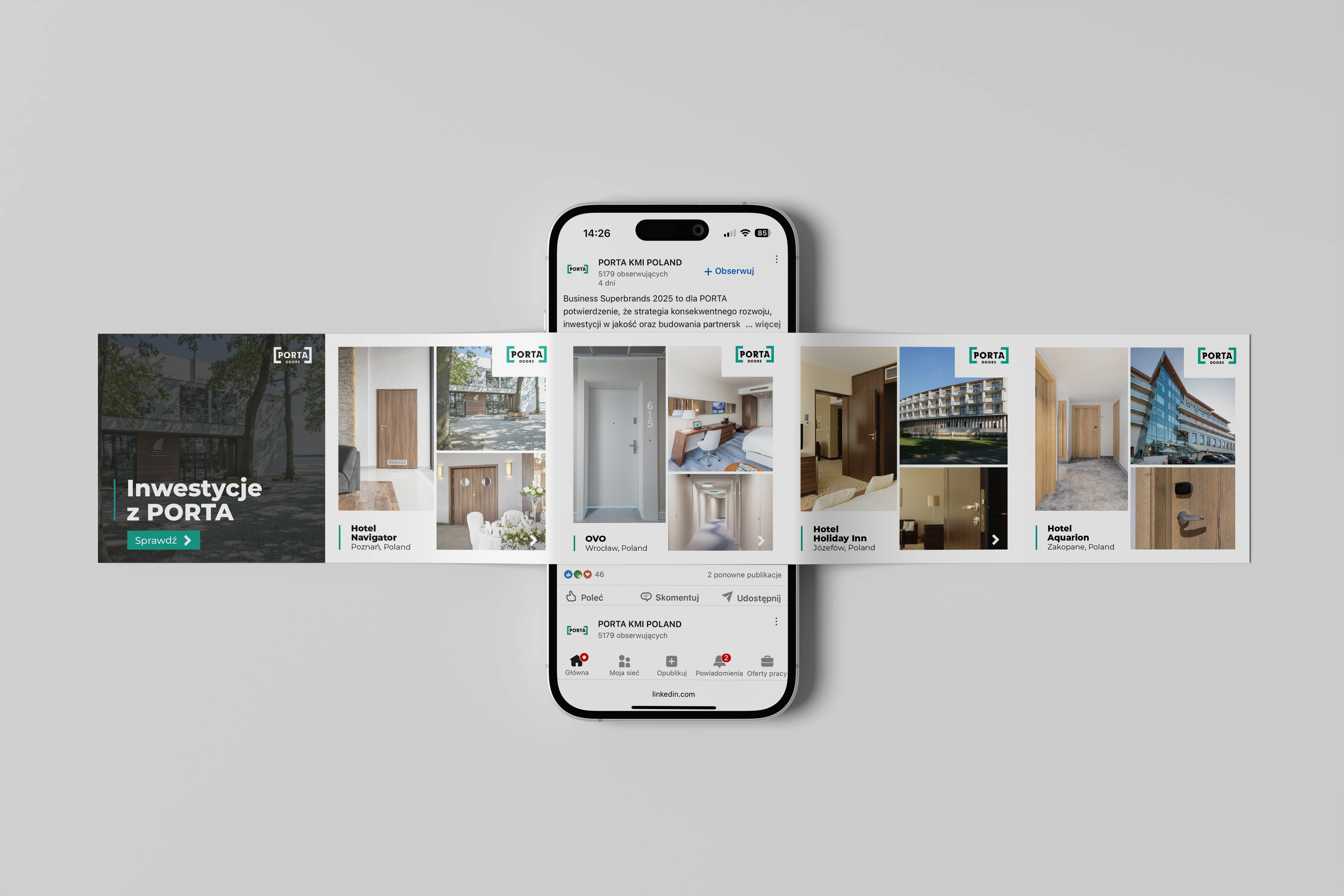 PORTA stanęła przed wyzwaniem stworzenia jednolitej i estetycznie spójnej komunikacji na LinkedIn, obejmującej trzy języki: angielski, polski oraz czeski. Do tej pory materiały publikowane przez różne oddziały prezentowały się bardzo różnie — zarówno pod względem stylu, jak i jakości, co niestety sprawiało, że trudno było ukształtować spójny obraz marki. Firma planowała wypuścić nową funkcję kreatora drzwi, która wymagała przedstawienia w formie animowanego przewodnika — tak, żeby była łatwa do zrozumienia i atrakcyjna dla odbiorców.