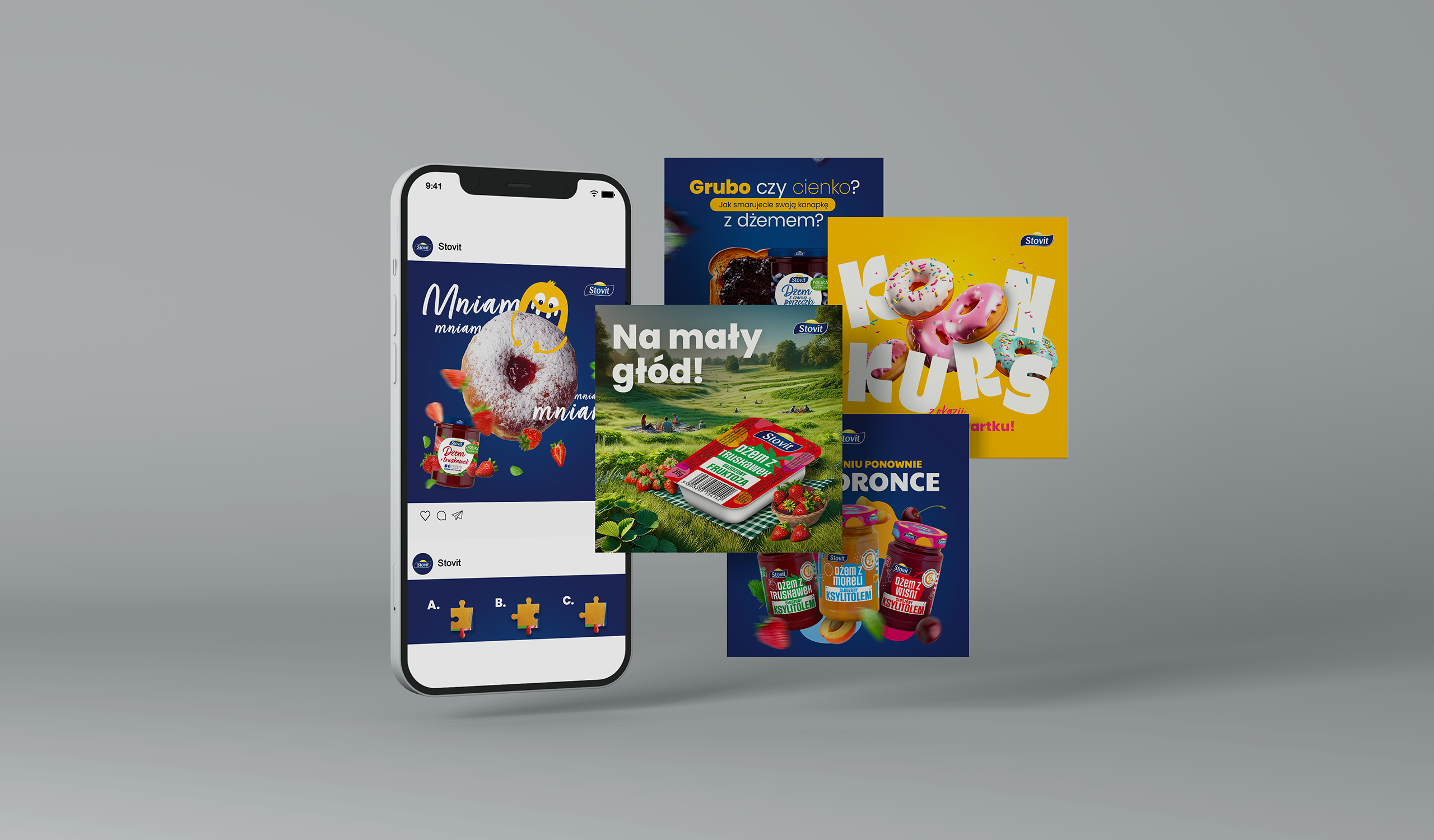 Marka Stovit zwróciła się do nas z potrzebą odświeżenia swojego wizerunku w kanałach social media. Chodziło przede wszystkim o zwiększenie spójności wizualnej, stworzenie bardziej nowoczesnej estetyki i zbudowanie większego zaangażowania wśród odbiorców. Wspólnie z klientem postawiliśmy na komunikację opartą na pozytywnych emocjach związanych z jedzeniem – radości, wolności wyboru, przyjemności z codziennych smaków. Naszym zadaniem było nadanie tej idei atrakcyjnej, nowoczesnej oprawy graficznej.